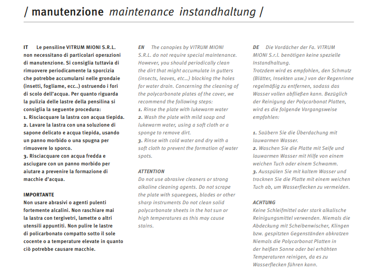 La copertura piana, con travi di soli 200 mm, è realizzata con lastre di vetro la cui inclinazione favorisce un’ottimale raccolta delle acque piovane nella grondaia frontale e lo scarico all’interno delle colonne.