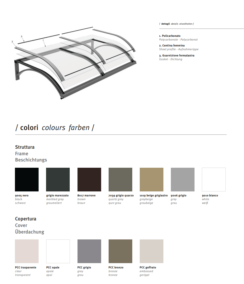 La copertura è realizzata con lastre di policarbonato compatto di spessore 4 mm, disponibili in un’ampia gamma di colorazioni e complete di profilo fermalastra con guarnizioni di tenuta.