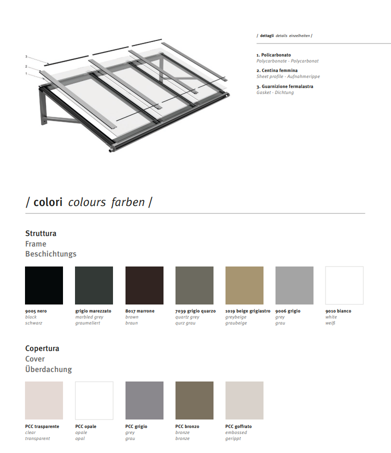 La tettoia in alluminio è corredata da un profilo gocciolatoio che