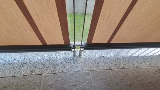 Tenda a caduta con cavi in acciaio inox e terminale contrappesato. Modello corredato di bloccaggio semi-automatico per il bloccaggio del telo a fine corsa.