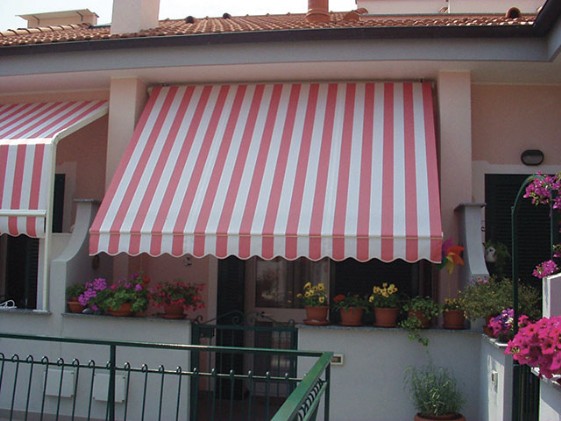 Tenda a supporti indipendenti assemblata combinando strutture laccate di nostra produzione e tessuti di ottima qualità.